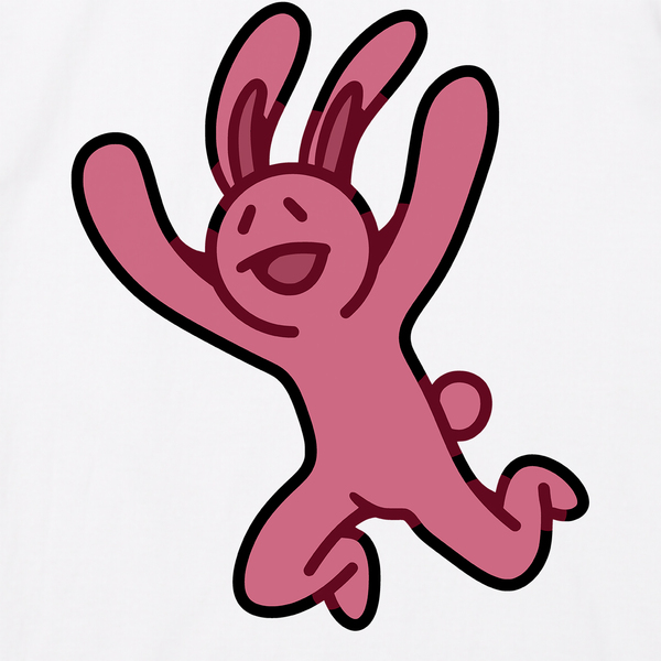 ジャンプをした後のピンク色のウサギのデザインTシャツです。